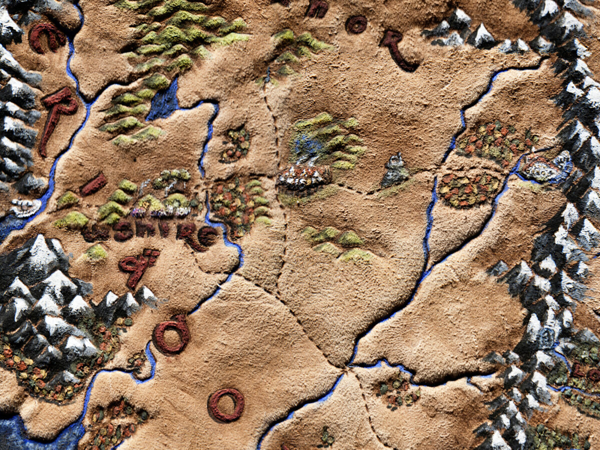 I love being commissioned by subject-matter-experts, in this cas a Tolkien Scholar. So many little details and easter eggs went into this map, and that’s after compiling it from multiple other sources (some inaccurate). This map also pushed the limits when it comes to 3D elements, with every forest made of a separate piece of leather, cut, burned, painted, and glued onto the map. Even some of the mountains were cut away, and forests tucked behind them, for an extra 3D look.